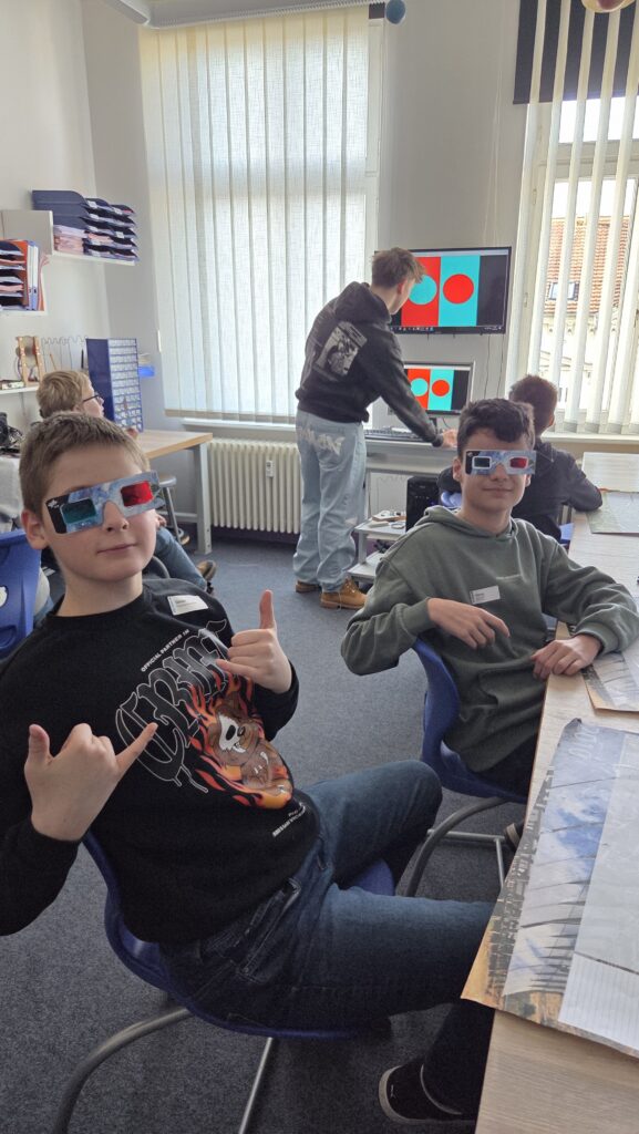 Technisch wurde es bei der Roboterstation. Hier durften wir selbst ausprobieren, tüfteln und steuern. Gar nicht so leicht, aber auf jeden Fall richtig spannend. Und dann ging’s noch um den roten Planeten – also den Mars. Dabei haben wir sogar eigene 3D-Brillen gebaut und gelernt, wie räumliches Sehen funktioniert. Ziemlich cool, wenn plötzlich alles plastisch vor einem auftaucht!